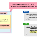 上記のように、浮動化したボックスの後ろにclearプロパティを指定した要素を配置することで、親要素は子要素の終わり位置を把握することができるため、高さを確保することができるようになります。この方法の場合、浮動化したボックスの後ろに必ず指定をしなければ解除することができないため、「レイアウトにより不要なHTML要素が増える」などの問題が発生します。